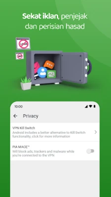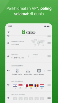 Bayangkan kebebasan melayari internet tanpa bimbang, di mana privasi anda sentiasa terpelihara dan data peribadi anda dilindungi sepenuhnya. Inilah realiti yang dibawa oleh Private Internet Access®, perkhidmatan Rangkaian Peribadi Maya (VPN) terunggul di dunia, direka khas untuk pengguna Android yang mencari ketenangan fikiran dalam talian. Alami perlindungan siber yang teguh, kelajuan sambungan sepantas kilat, dan akses tanpa had ke kandungan global. Dengan infrastruktur yang luas dan komitmen yang tidak berbelah bahagi terhadap kerahsiaan, kami memastikan setiap sesi dalam talian anda terlindung daripada ancaman dan pencerobohan, di mana jua anda berada.